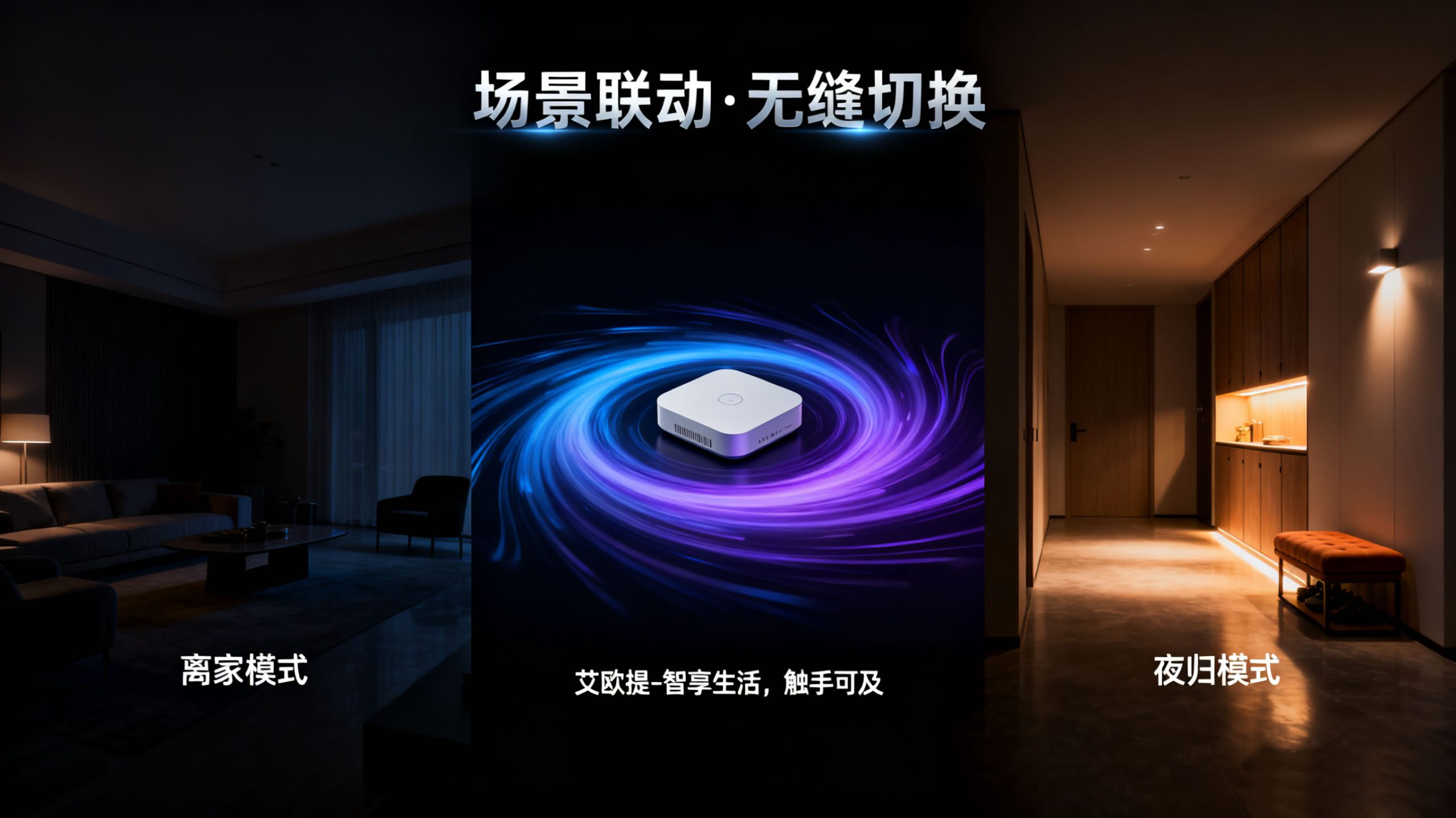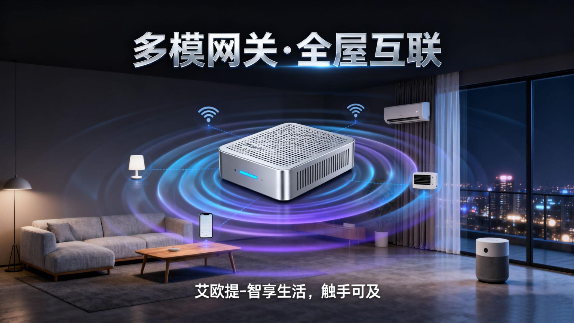 艾欧提多模网关:作为系统 “大脑”,同时支持 Zigbee 与 Wi-Fi 两种通信协议,可兼容后续所有执行层、传感层设备;设备需连接家庭电源与无线网络,建议安装在客厅中部或角落(避免信号遮挡),确保信号覆盖全屋所有设备安装区域;具备断网缓存功能,断网时可维持本地基础场景联动(如人体传感器触发灯光),联网后自动同步数据。