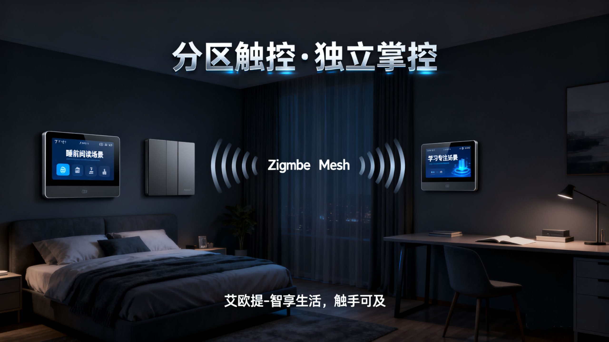 主卧、客厅部署艾欧提智能面板,次卧部署同规格智能面板;面板采用 7 英寸电容触控屏,支持触控、语音(离线语音指令库≥50 条,如 “打开主卧灯光”“启动观影模式”)双操作,内置 16GB 存储模块,可独立存储 5 组个性化场景(每组场景包含 3-8 个设备联动指令)。