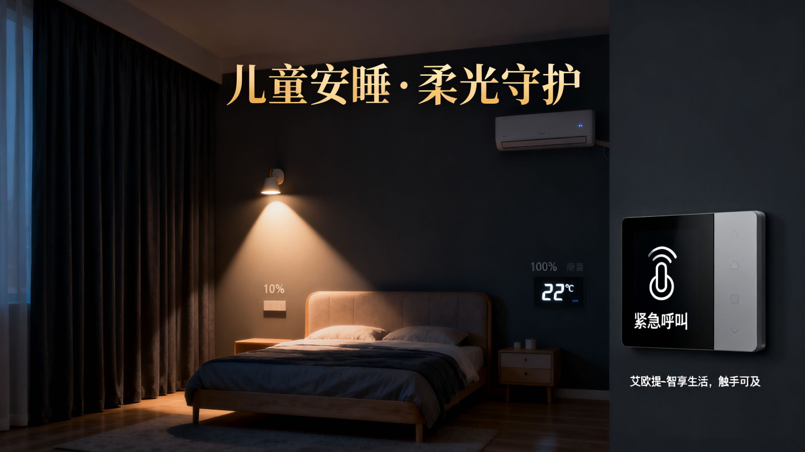 第五步:面板静音(儿童房智能面板进入 “静音模式”,关闭所有操作提示音(除防夹、报警等安全提示外),屏幕亮度降至 10%(避免光线干扰),并自动隐藏 “娱乐”“设置” 等非必要栏目,仅保留 “紧急呼叫”“取消安睡模式” 两个功能图标)。