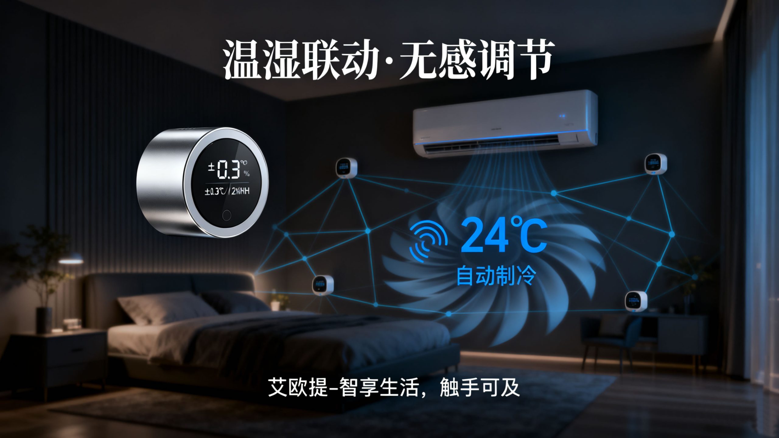 客厅、主卧、次卧各安装 1 台艾欧提温湿度传感器,设备参数:温度测量范围 - 10℃-65℃(精度 ±0.3℃),湿度测量范围 0%-100% RH(精度 ±2% RH),采样周期默认 1 次 / 分钟(当检测到温度波动≥2℃或湿度波动≥5% RH 时,采样周期自动切换为 1 次 / 10 秒,确保数据实时性),工作电压 DC 3V(2 节 AA 碱性电池),无线传输距离≤20 米(无遮挡环境);