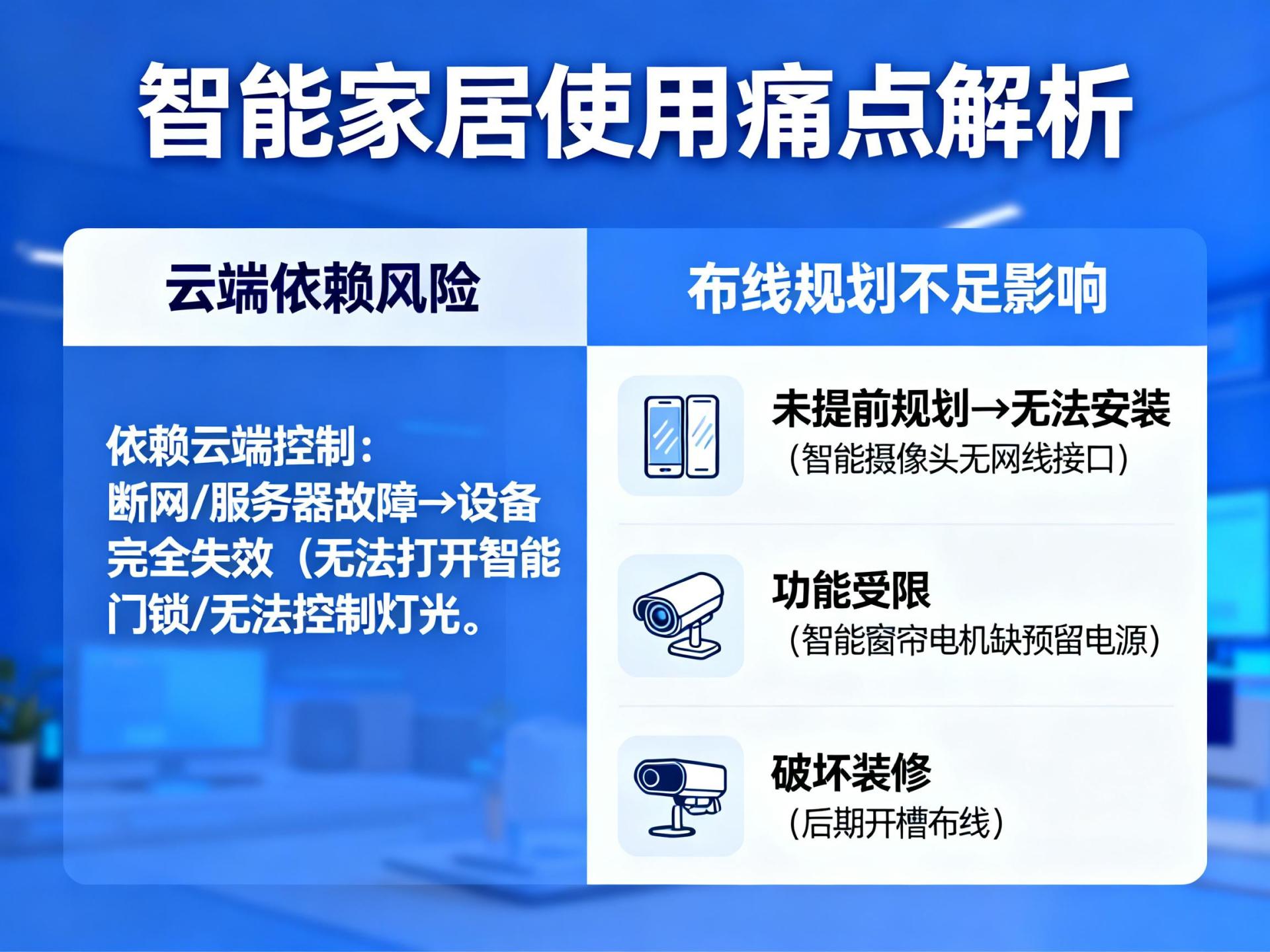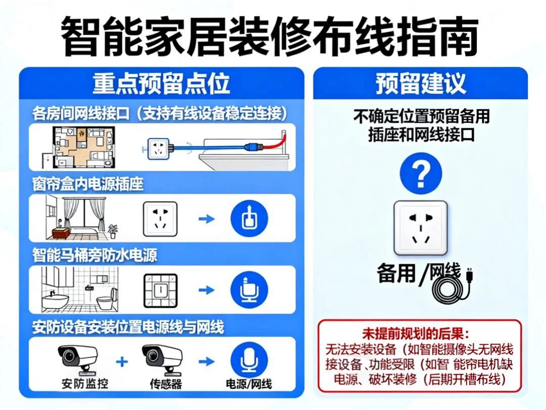智能家居对布线有特殊要求,若装修时未提前规划,后期可能出现无法安装设备(如智能摄像头无网线接口)、设备功能受限(如智能窗帘电机缺预留电源)或破坏装修(如后期开槽布线)的问题。
