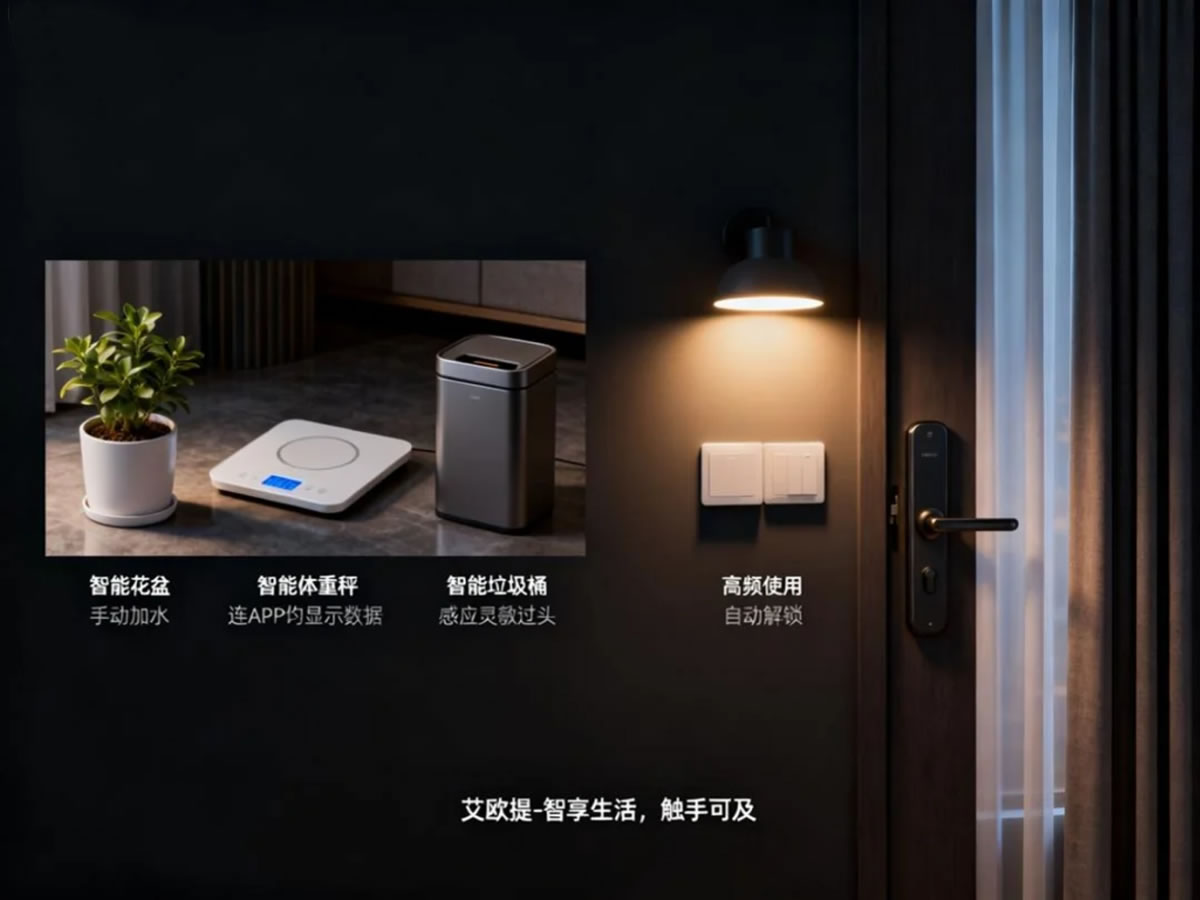 第一个智商税,盲目追求 “全套智能”。之前听商家说 “全屋智能才够档次”,就咬牙买了智能花盆、智能体重秤、甚至智能垃圾桶,结果智能花盆要手动加水,APP 提醒浇水跟没提醒一样;智能垃圾桶感应灵敏过头,路过就开盖,反而费电;体重秤连 APP 只能看数据,还不如普通款实用,白扔小两千。其实根本不用搞这些使用率低的设备,优先选灯光、门锁、窗帘这三类天天用的刚需款,像艾欧提的灯光 + 门锁 + 窗帘基础套装,刚好覆盖日常高频场景,不用额外买没用的设备,省不少冤枉钱。