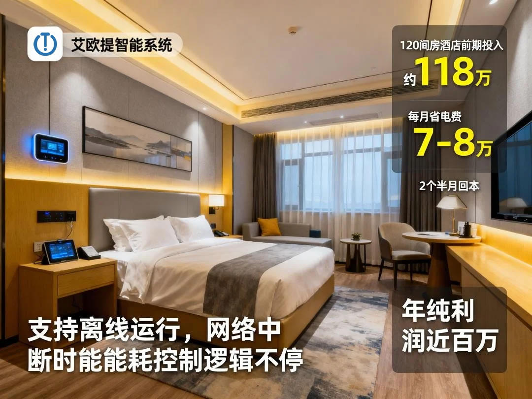 艾欧提这套系统支持离线运行,就算网络中断,能耗控制逻辑也不会停,工程商不用反复跑现场排查网络问题;对投资商和酒店老板来说,更实在的是回报周期 —— 按实测数据,120 间房的酒店,前期投入约 18 万,每月省电费 7-8 万,2 个半月就能回本,之后每年多赚近百万纯利润。